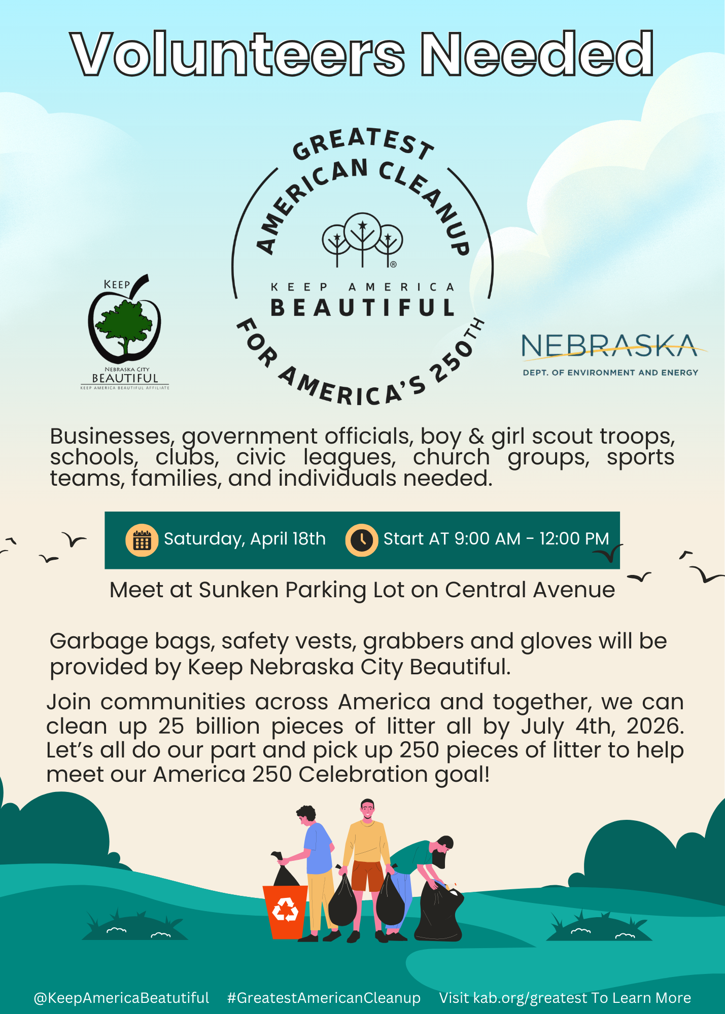 Greatest American Cleanup Saturday, April 18, 2026 9:00 AM 12:00 PM 09:00 12:00 Sunken Parking Lot Nebraska City, NE 68410 (map) Google Calendar ICS America 250th Meet at Sunken Parking Lot on Central Avenue for Supplies