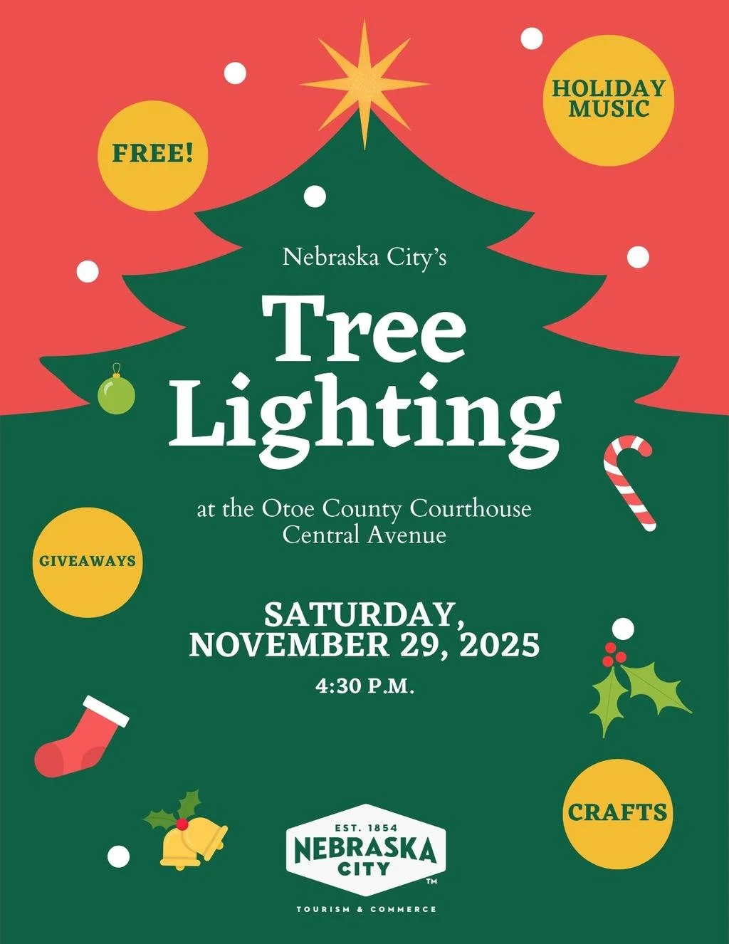 Nebraska City Tree Lighting Saturday, November 29, 2025 4:30 PM 5:30 PM 16:30 17:30 Otoe County Courthouse Nebraska City, NE 68410 (map) Google Calendar ICS We will be handing out reusable bags. We hope to see you there!